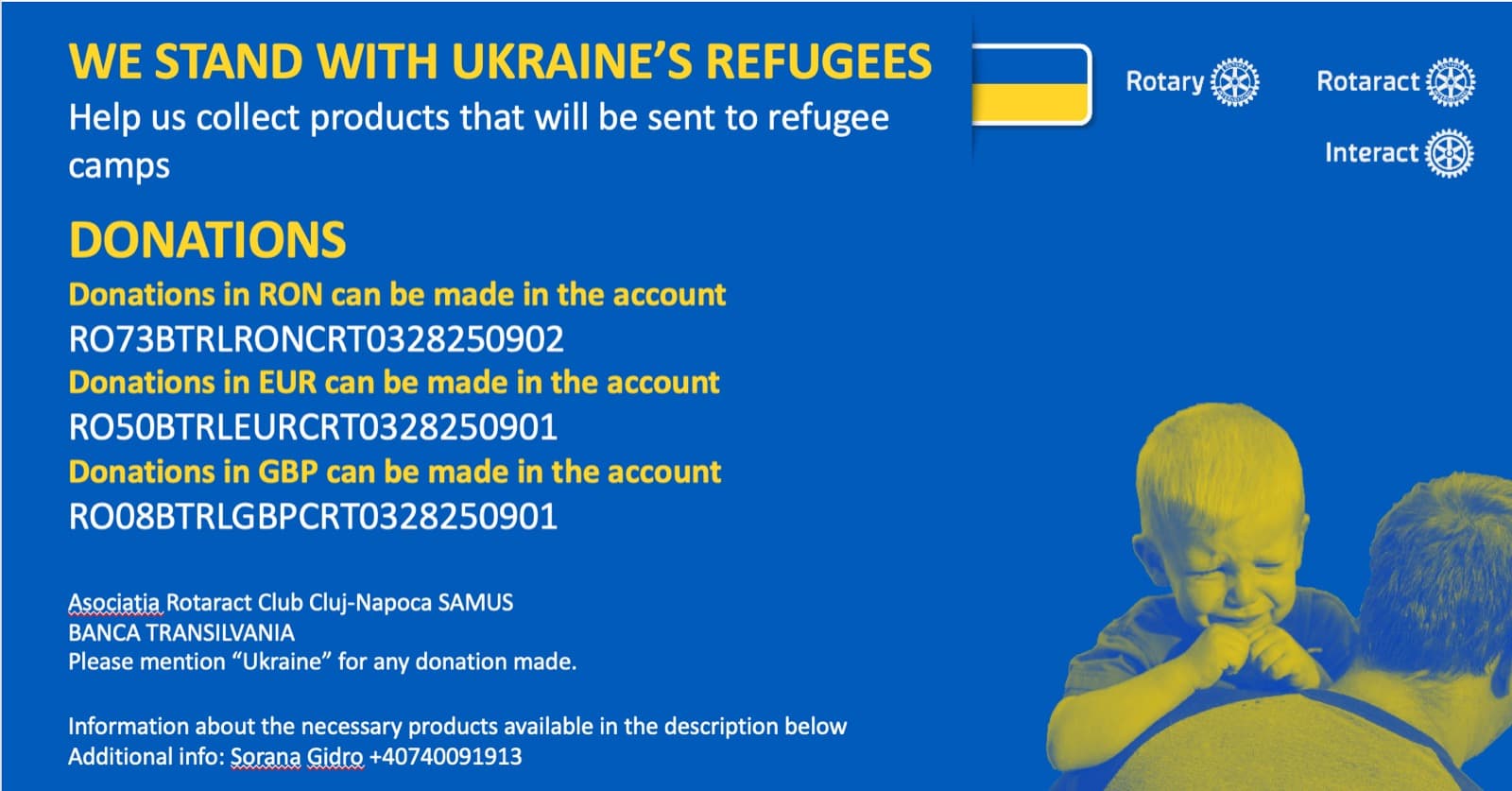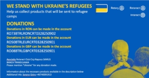 Rotary and Rotaract clubs are coordinating sheltering people coming from Ukraine with Rotaractors on the border, transportation with aid to Ukraine. Now the most needed supplies are non-perishable foods, canned food, instant soup, powdered milk, UHT milk, diapers, soap, shower gel, blankets, sleeping bags, disinfectants, pads, toilet paper, wet wipes, clothes, and shoes.